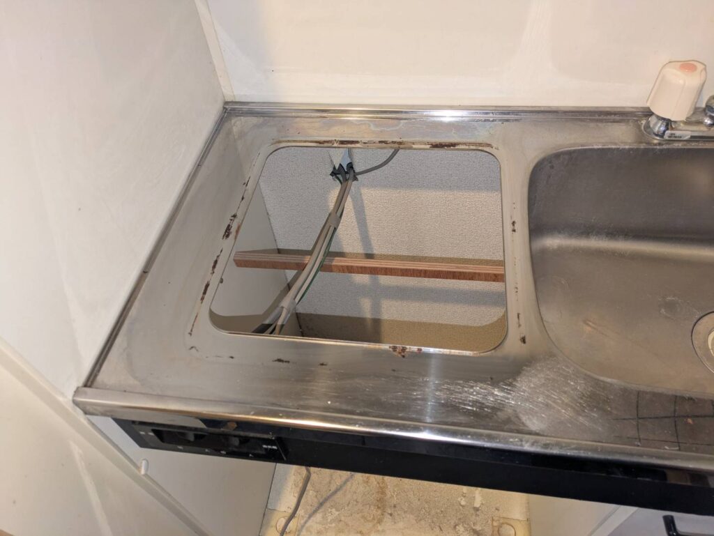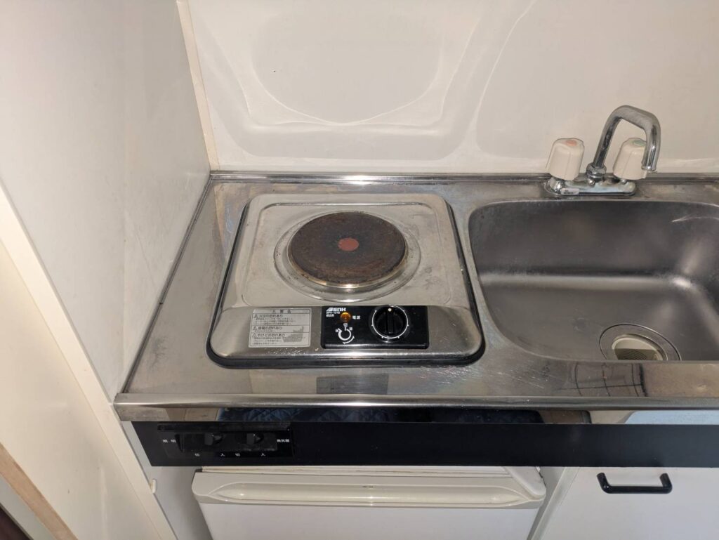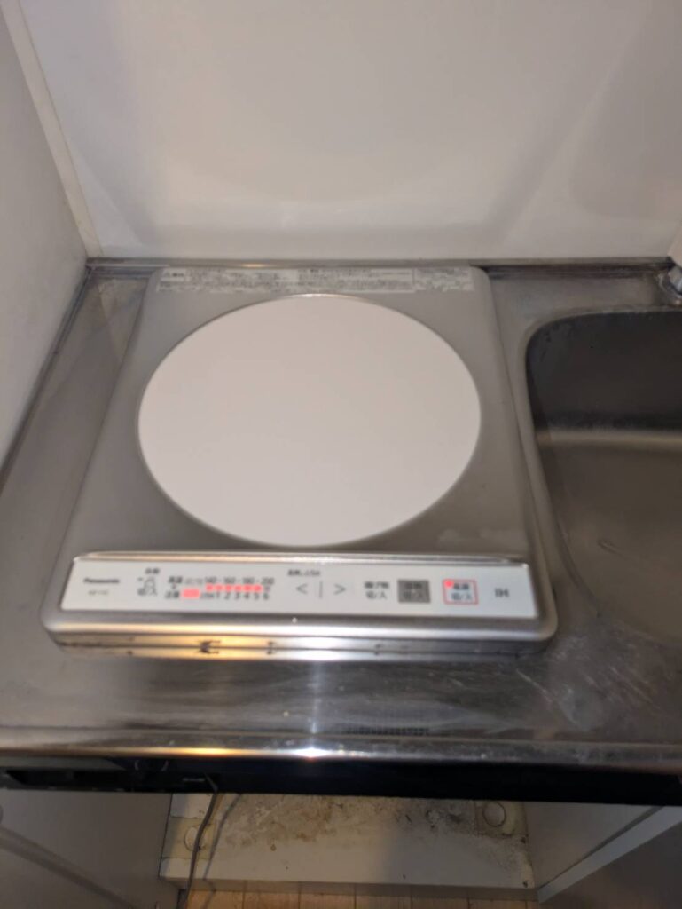 賃貸アパートのミニキッチンにて、古い電気コンロから最新のIHクッキングヒーターへの交換を行いました。